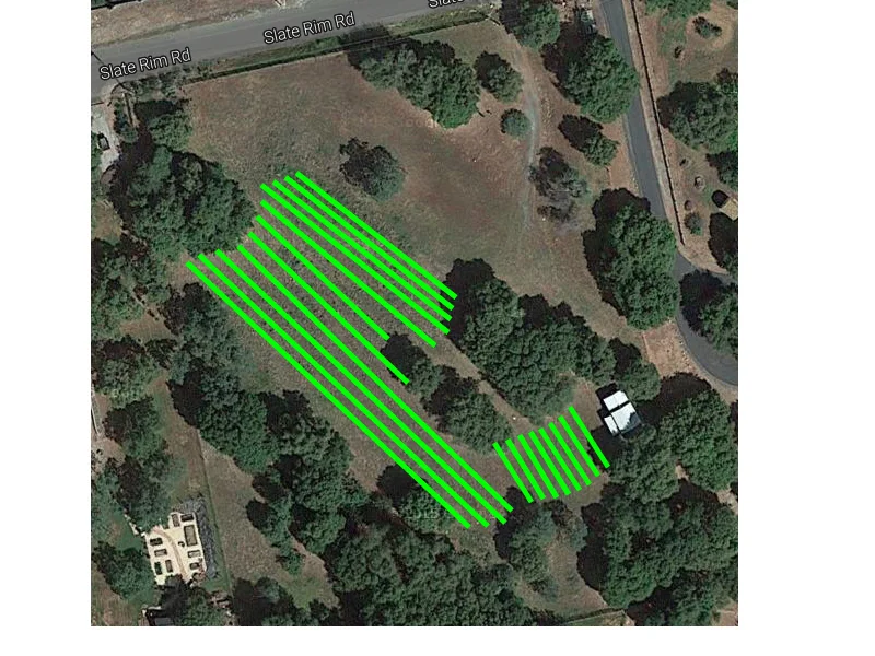 View: This is the smaller of our two planting sites; I have started establishing preliminary markers for our t-posts in this section because it is the most square. Originally I had determined to use 7x7 spacing; that is, seven feet between rows and seven feet between posts. I am now considering using eight foot spacing to provide more room for cover crop management and mowing. Oh, and by the way...getting rows straight is MUCH harder than it looks.